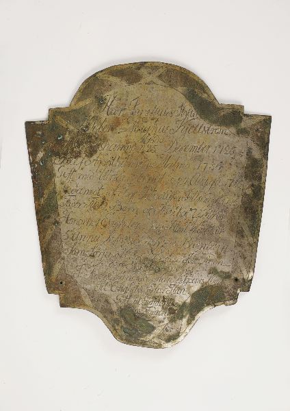 Mässingplatta i form av en sköld för gravsmyckning. Plattans kant har en gravering i form av en girlang lindad med band.