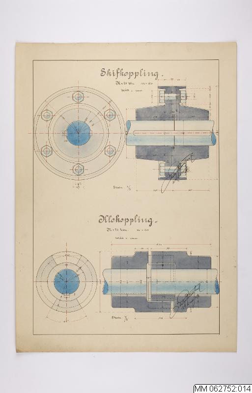 - Ritning med rubriken "Skifkoppling. Klokoppling". Elevarbete utfört av Helge Petersson under sin utbildning på Kungliga Tekniska Högskolan i Stockholm åren 1897-1901. Plan-, profil- och sektionsritningar av två olika typer av kopplingar, skivkoppling och klokoppling