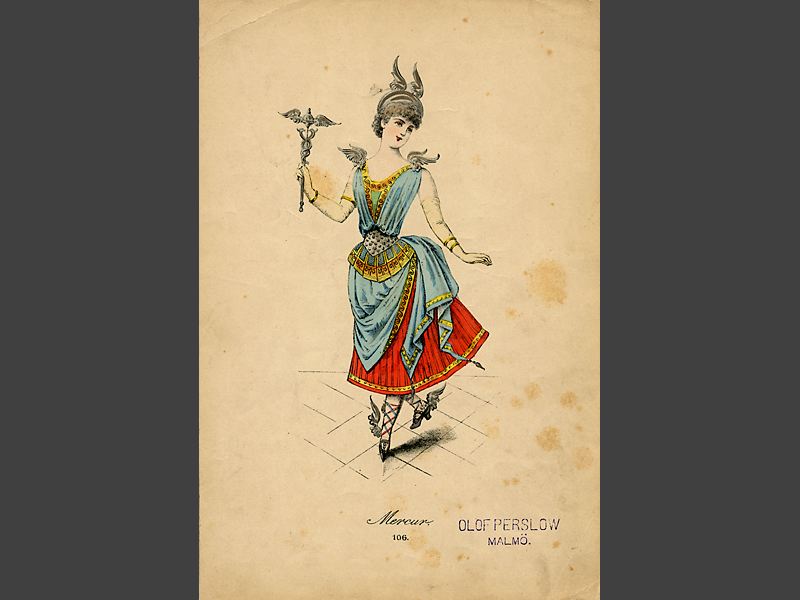 - Modeplansch med osignerad illustration under rubriken "Mercur". Kvinnlig modell i fantasifull / historisk klädedräkt. Namnstämpel på tryckarket: Olof Perslow. Malmö. Förmodad bilaga till modetidskrift. Tryck nr 106.