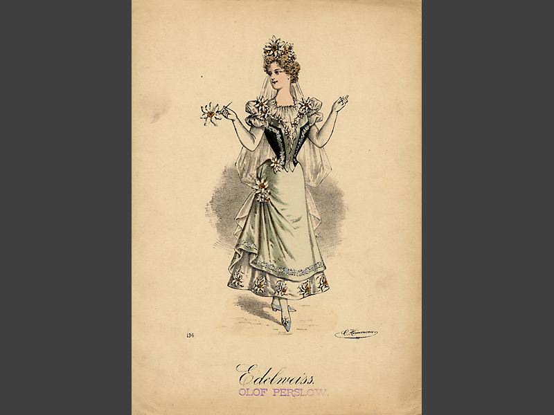 - Modeplansch med illustration av C. Heinemann under rubriken "Edelweiss". Kvinnlig modell i fantasifull / historisk klädedräkt. Namnstämpel på tryckarket: Olof Perslow. Förmodad bilaga till modetidskrift. Tryck nr 134.