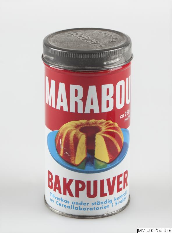 Plåtburk för Marabou bakpulver. Tillverkas under ständig kontroll av Cereallaboratoriet i Svalöv.