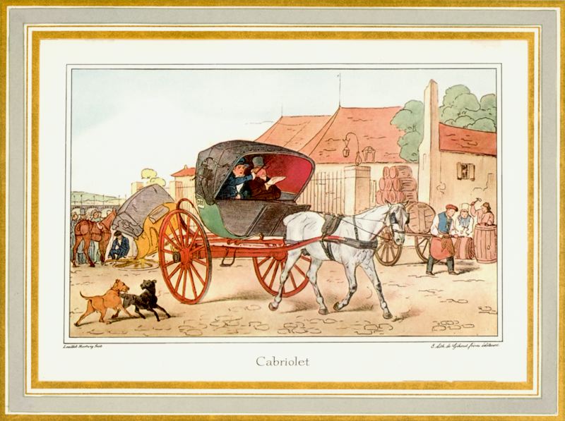 Litografi, färgtryck. En tvåhjulig droska dragen av en vit häst och med kusk och en passagerare kör på en gata i ett samhälle. I bakgrunden till vänster har en vagn tappat ett hjul vilket orsakat en mindre folksamling och till höger drar en man en vagn lastad med tunnor och två andra håller på att tillverka tunnor.