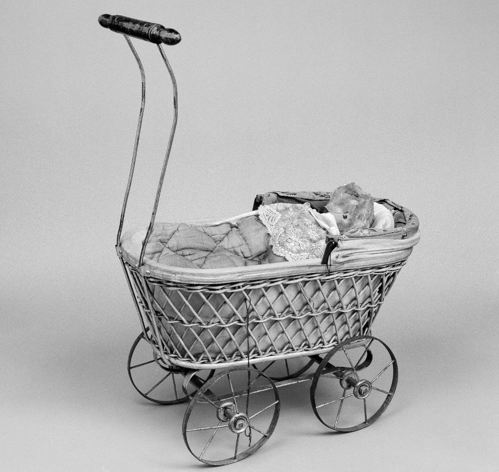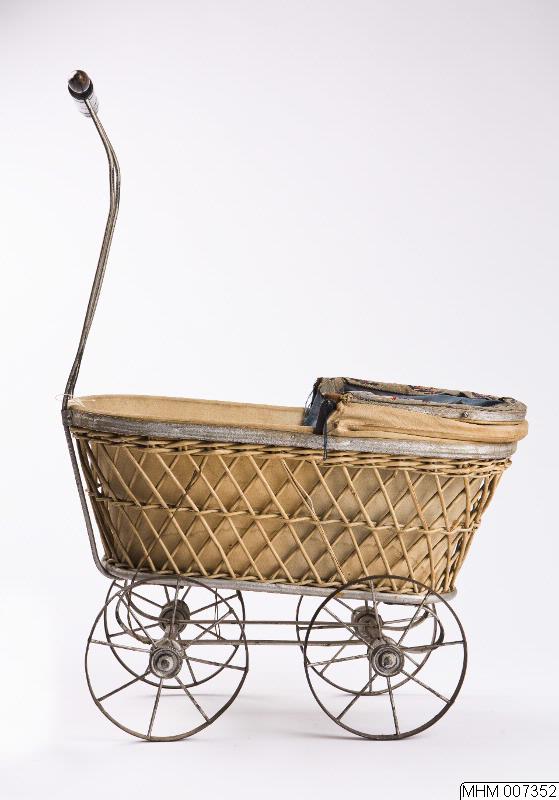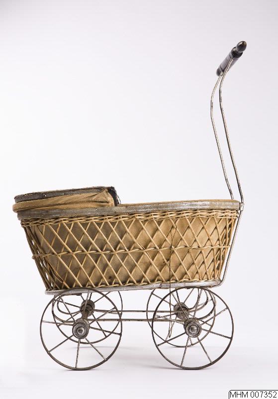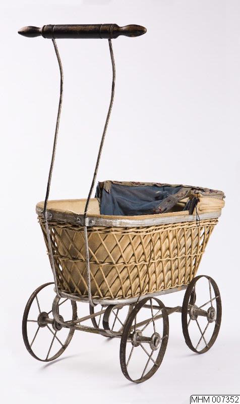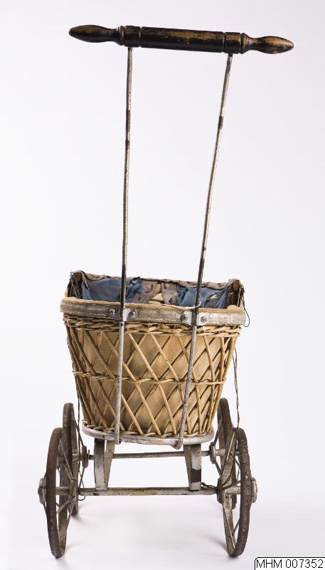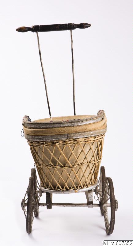 Dockvagn, fätad av vidjor, botten av trä, underrede och hjul av järn.