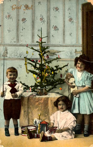 från Gösta & Gunnar. Poststämplat 24/12 1910. Bild: kolorerat foto med tre barn