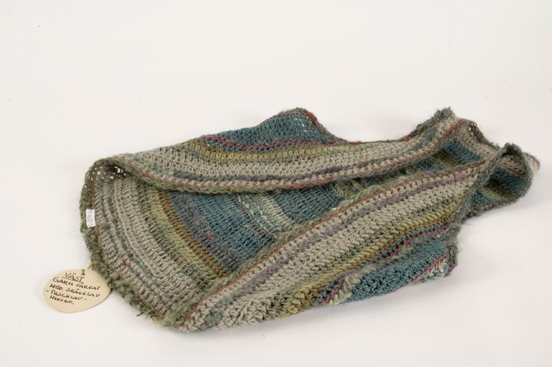 Väst virkad av växtfärgat ullgarn, broderad med smala ränder av mörkrosa ullgarn. Västen är virkad i ett stycke, endast sydd vid axlarna. Runt hela västen är en tunn gröngrå kant virkad. På västen är en rund pappersetikett fastsatt med texten: