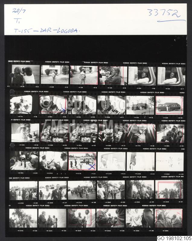 GO 198102:105 :: byggnad, bybebyggelse, teatergrupp, buss, man, kvinna, barn