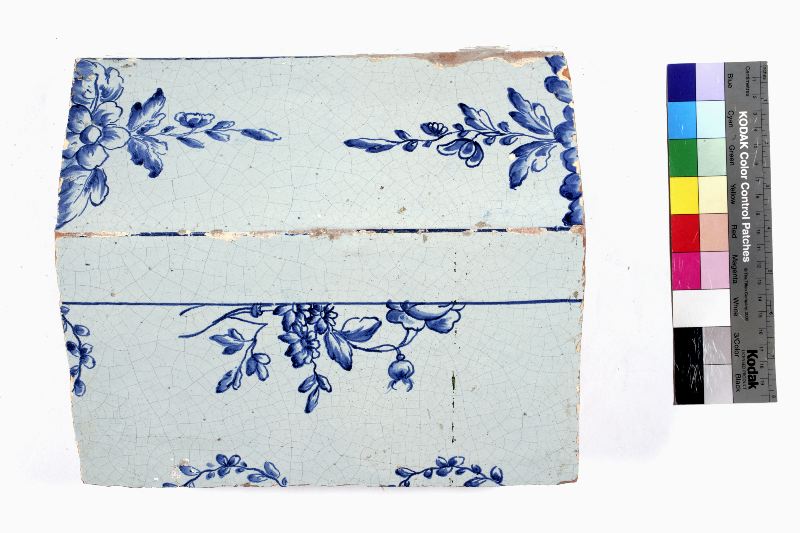 Kakelplatta av fajans med blå blomsterdekor på mycket ljust gråblå botten. Kakelplattan är vinklad. På ena sidan är motivet små blommor sammanhållna i en bukett samt små bladgirlanger. Motivet försvinner bakom ett avgränsande blått streck. På andra sidan är det upptill och nertill en halv blomma med stora blad, med utlöpare som strävar mot mitten från vars ett håll. All dekor är målad i blå nyanser med en tunn pensel. Glasyren är krackelerad. På baksidan finns rester av en uppbyggd rump.
