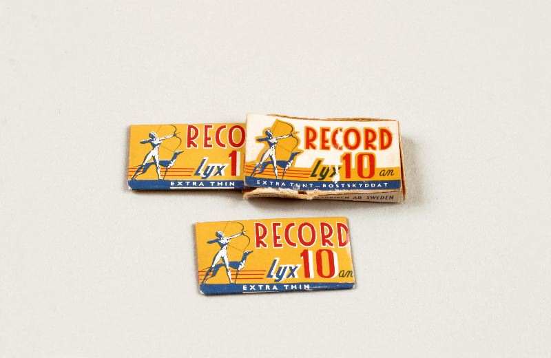 Pappask med tryck i rött, vitt, blått och gult. Innehåller två pappersinslagna rakblad.