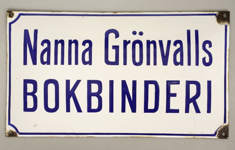 Skylt av emaljerad plåt. Rektangulär plåt, något bukig, emaljerad på den bukiga sidan. Vit botten med mörkblå text på två rader och smal mörkblå rand. Text: Nanna Grönvalls / Bokbinderi. I vardera hörn hål för fastskruvning av skylten.