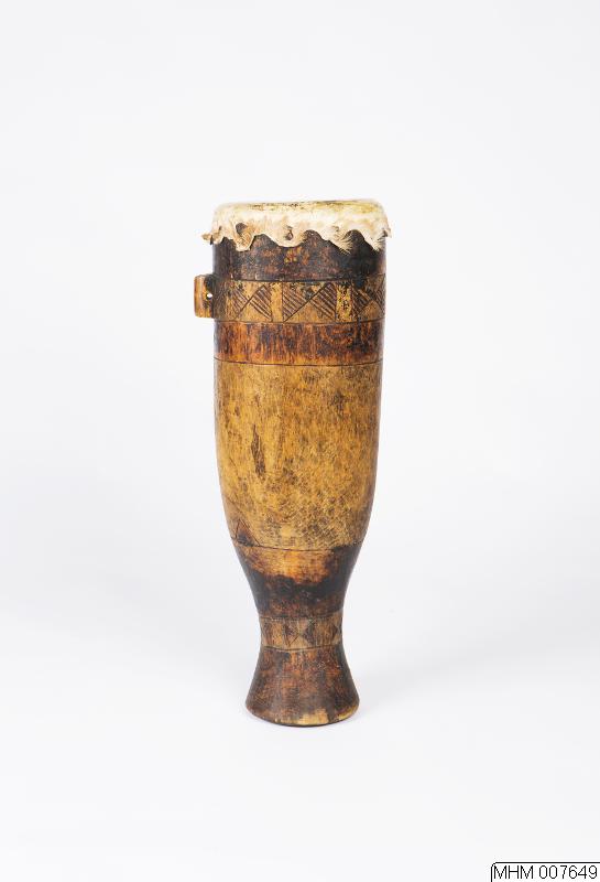 Trumma gjord av trä med trumskinn av skinn. Trumskinnet fastsatt i