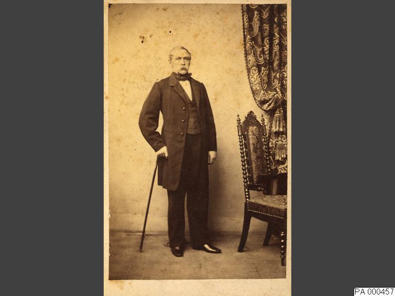 Visitkortsfotografi. Porträtt av ryttmästare Anders Gabriel Krook, hålland käpp, stående vid stol, bredvid draperi.