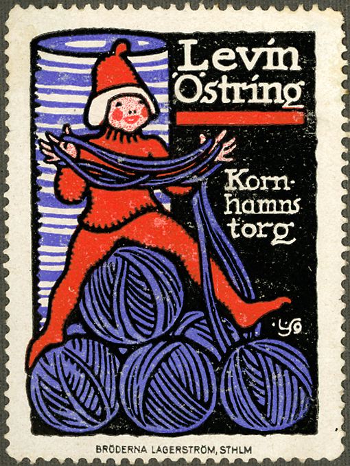 Rött, blåt och svart tryck på vitt papper. En pojke nysta garn. Text: Levin Östring Kornhamns torg.