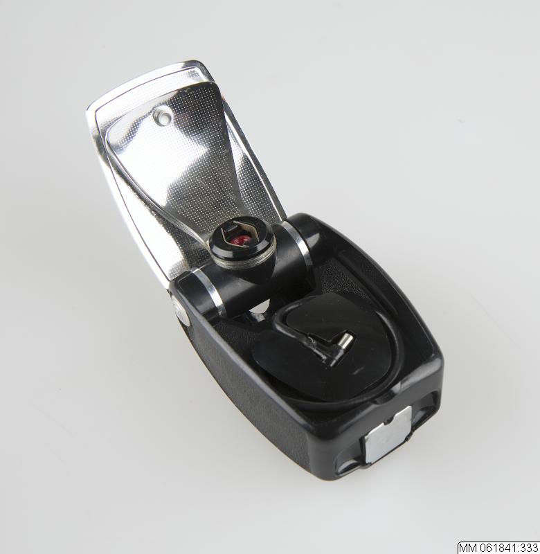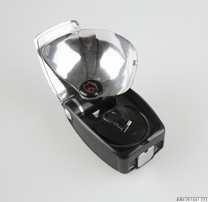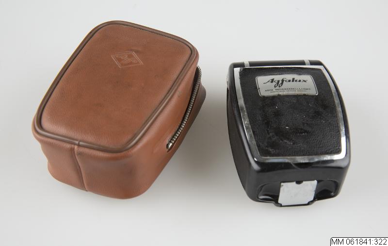 Elektronisk fotoblixt i väska av brun vinyl. Laddas med blixtlampa. Utfällbar reflektor bestående av metallameller. Drivs av 22,5 volts batteri. Sladd för sammankoppling med kamera.
