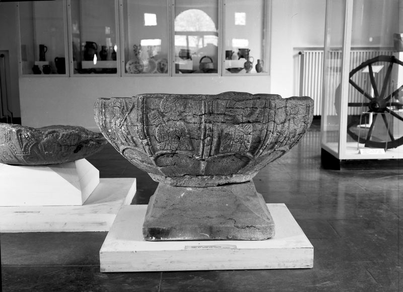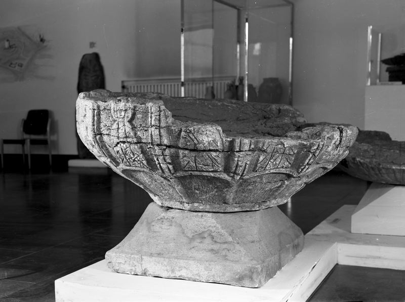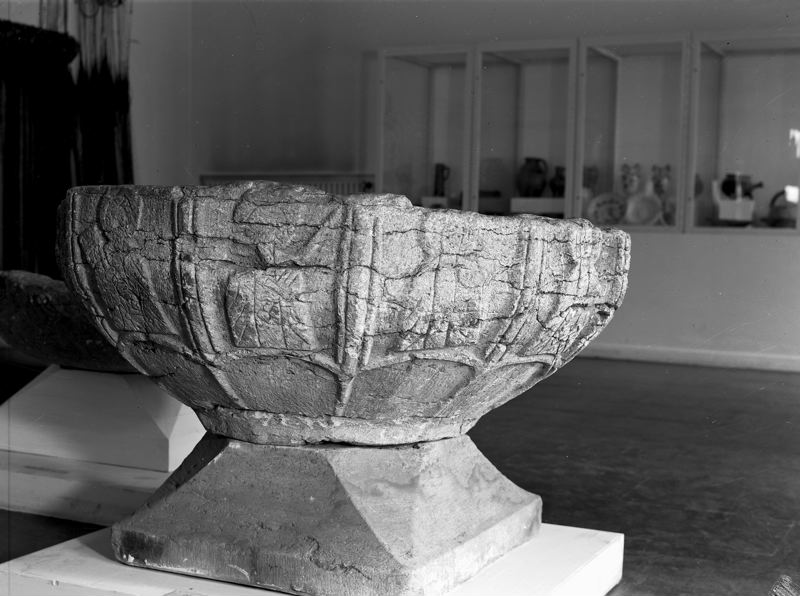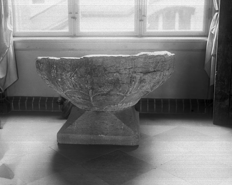 Dopfunt af kalksten, å fyrkantig fot af dito, skålen tolfkantig med figurer i låg relief: (troligen de tolf apostlarna: Petrus med nyckeln, Andreas med andreaskorset, 1 med uppåtriktadt svärd, 1 med nedåtriktadt dito, 1 med kalk, öfriga otydliga); starkt skadad.