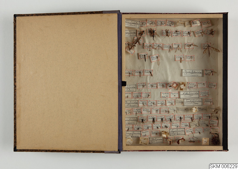 - Insektssamling i marmorerad pappkartong med glaslock. Utformad som en bok. På ryggen pappersetikett med skriven text: "Diptera". 94 stycken tvåvingar monterade på nålar märkta med latinska man, fyndort och årtal.