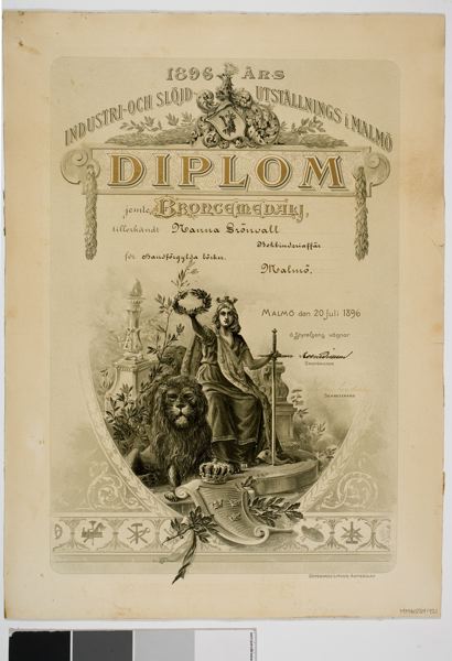 - Diplom till bronsmedalj för Nanna Grönvall, Bokbinderiaffär i Malmö, litografiskt tryck i svart, grått och brunt på vitt papper, upptill Malmö vapen och en kartusch, nedtill Svea, sittande med en lagerkrans i sin framsträckta hand, vid hennes fötter ett lejon, nederst bård med hantverksemblem. Text: 1896 års Industri- och Slöjd- utställnings i Malmö / Diplom / jemte Bronsmedalj, / tillerkändt Nanna Grönvall Bokbinderiaffär Malmö / för handförgylda böcker / Malmö den 20 Juli 1896 /---/.