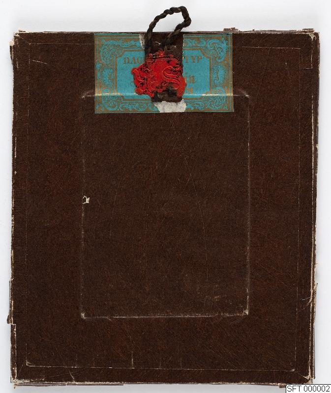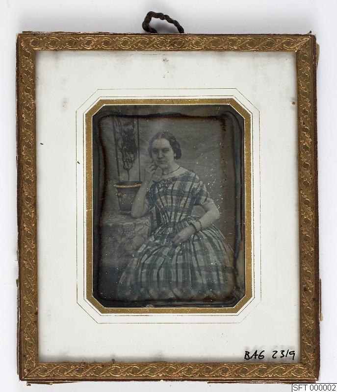 Daguerreotyp. Kvinna sittande. Firmamärket gömt under sigill "SR".