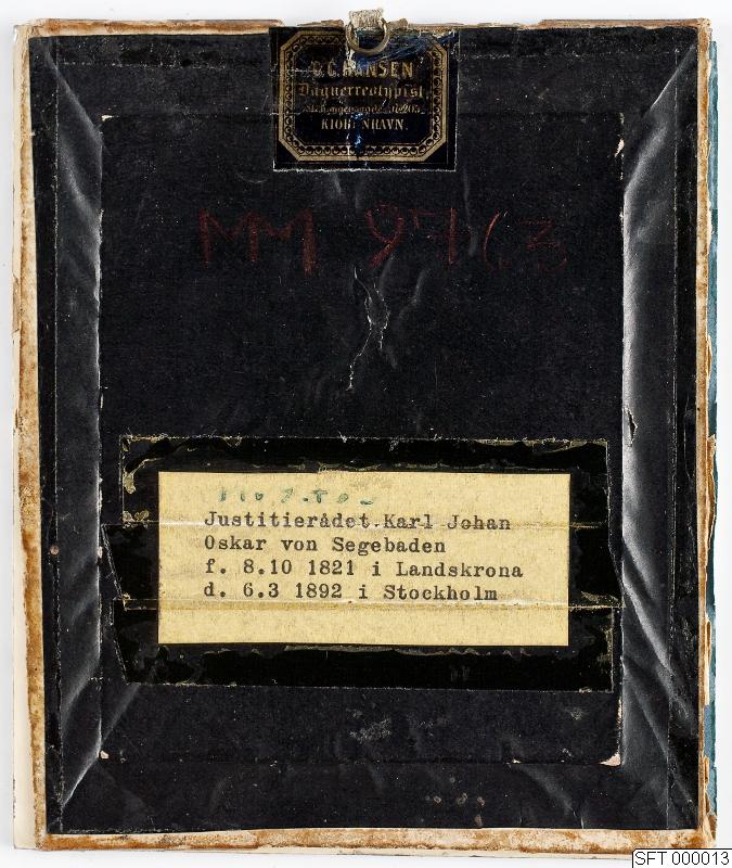Daguerreotyp. Porträtt föreställande justitierådet Karl Johan Oscar von Segebaden född 8.10.1821 i Landskrona, död 6.3.1892 i Stockholm. Fotograf C.C. Hansen, St. Kongensgade 205 Köpenhamn.