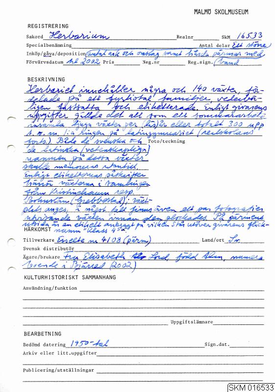 Herbarium innehållande drygt 140 växter på 40 familjer. Växterna är insamlade sommartid delvis i Bohuslän och Värmland. Upprättad av Elisabeth Alm, klass 4 5 a.