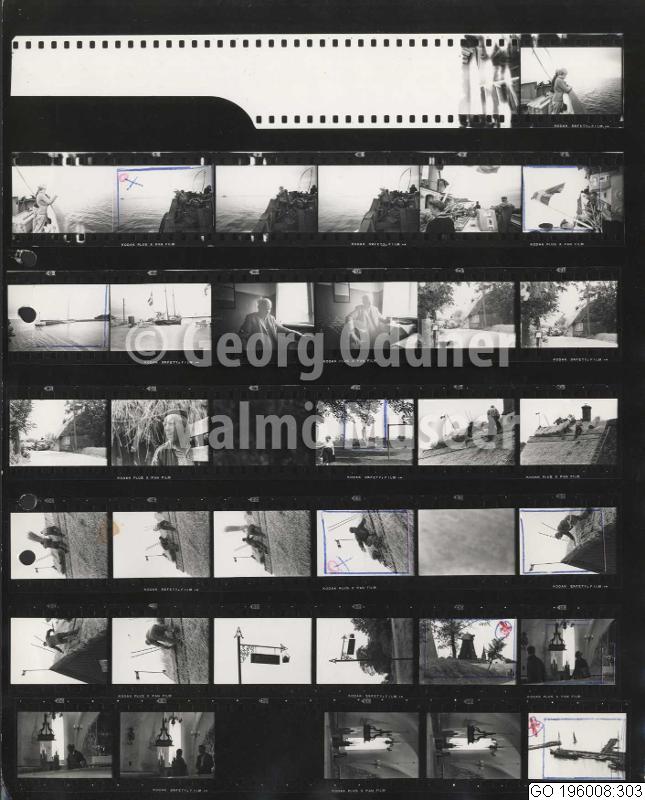 GO 196008:303 :: båt, hamn, man, takläggare, takläggningsarbete, väderkvarn, ö