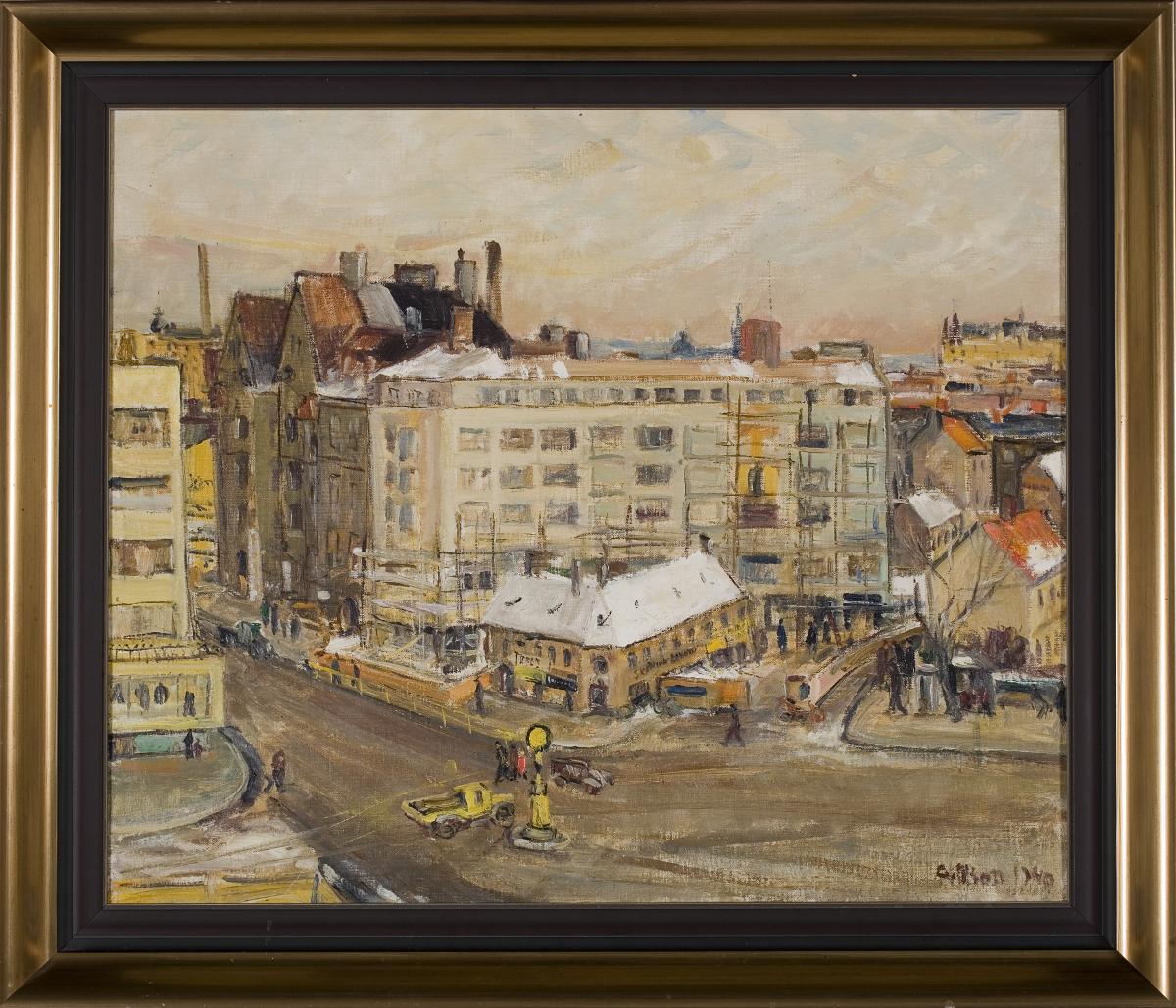 Målningen är sign och dat. 1940. Idoffcentrum ritades 1938 och Skånska Banken 1939.