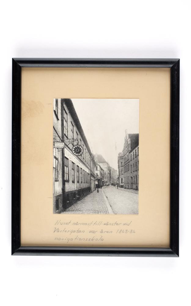 Svart/vitt fotografi som visar huset vid Västergatan 3 där den andra Navigationsskolan var inrymd 1843-1884. Blicken är riktad mot öster. Västergatan sträcker sig bort mot Adelgatan förbi tvärgatorna Frans Suellsgatan och Hamngatan. Fotot är ett reprofoto av ett kraftigt rastrerat tidningstryck.