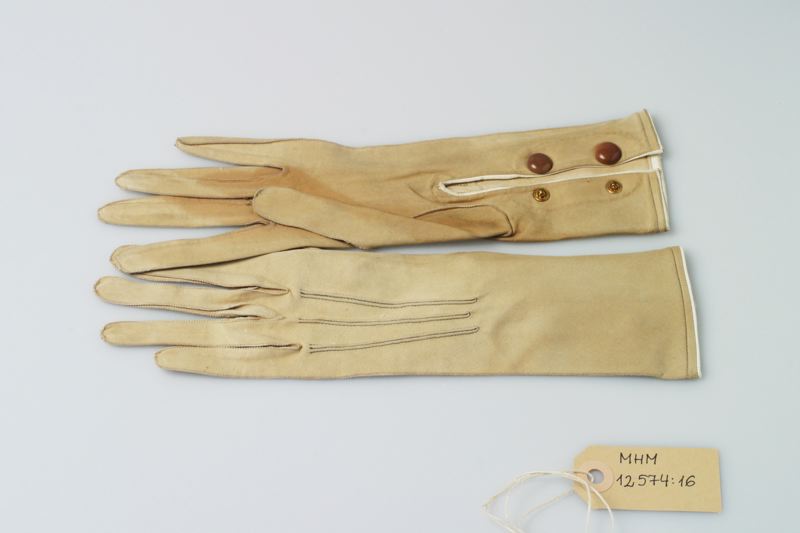 Ett par beige skinnhandskar med två stycken bruna tryckknappar vid handleden.