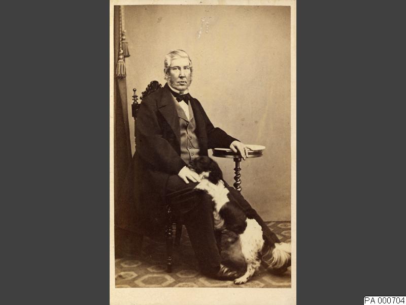 Visitkortsfotografi. Porträtt av Ludvig Wilhelm Dahlberg, sockerbagare i Malmö, tillsammans med sin hund.
