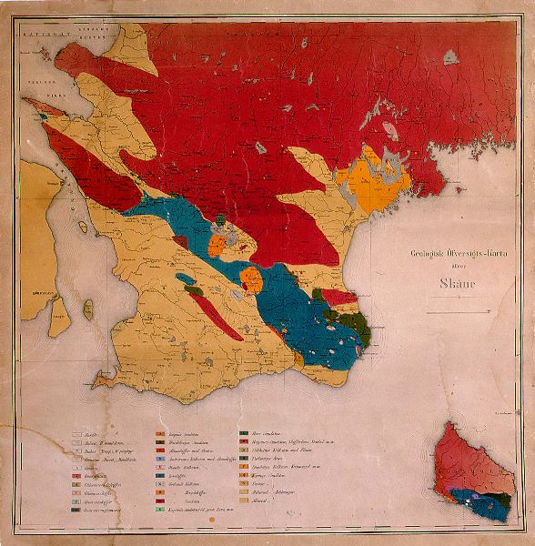 - Geologisk översikts karta av Skåne. Förutom Skåne finns Bornholm samt delar av Själland med. De olika mineralfyndplatserna är utmärkta med olika färger som i sin tur refererar till faktarutan i kartans underkant.
