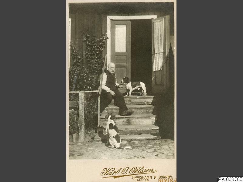 Visitkortsfotografi. Porträtt av garvaren Håkan Petersson i Tolånga som sitter på trappan till sitt hus med två hundar.