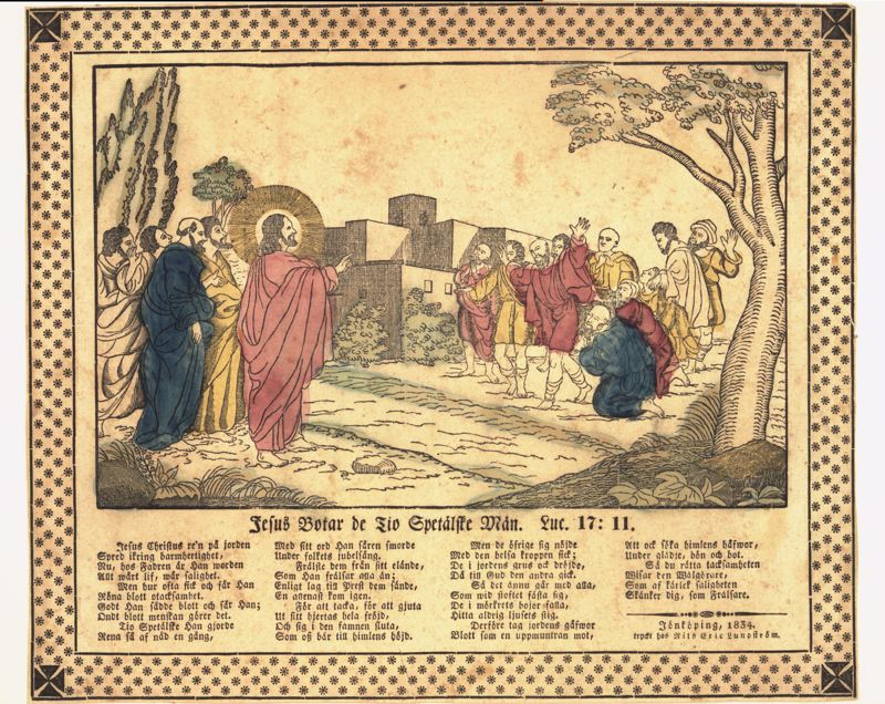 - Kistebrevet föreställer motivet när Jesus botar de tio spetälske männen. Till vänster står Jesus och fyra personer. Jesus är klädd i en fotsidmantel och med strålkrans kring sitt huvud. Han höjer sin ena arm mot de tio spetälske på hö. sidan. Av dessa står några med uppsträckta armar andra knäböjer inför åsynen av Jesus. I framkant finns en del växtlighet samt ett träd. I fonden syns några byggnader och träd. I underkant på bilden finns fyra textspalter med hänvisning till Luk. 17:11.Runt bildmotivet går en bård med snöstjärneliknade ornament.