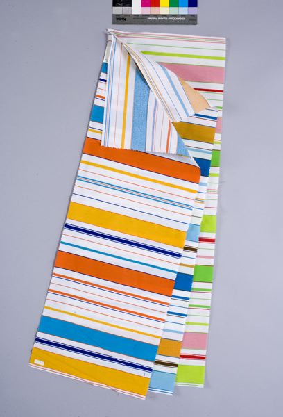 - Tygprover av tryckta bomullstyg. 3 olika färgställningar är ihoplagda i en bunt. Proverna är tryckta med smalare och tunnare ränder. Färgerna är klara och begränsade till fyra stycken + vit bottenfärg per prov. På varje prov sitter en liten klisterlapp med ett nummer.