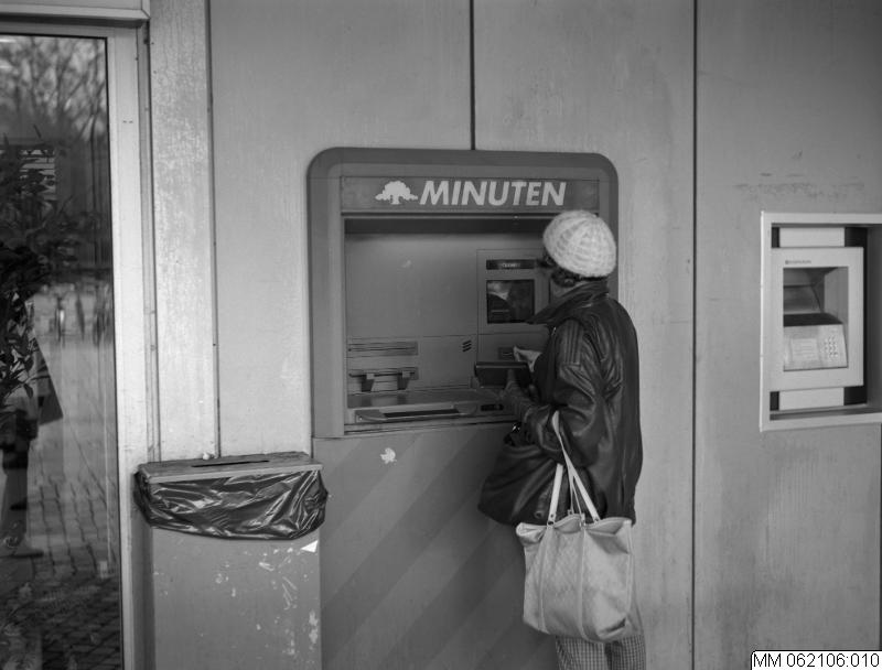 Kvinna (troligen fru Spak) vid bankomaten Minuten