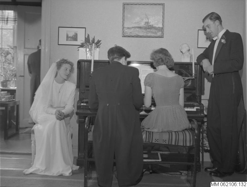 Rumsinteriör - par spelar piano, brudpar lyssnar
