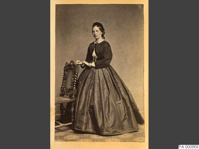 PA 000868 :: kvinna, klänning, huvudbonad, stol