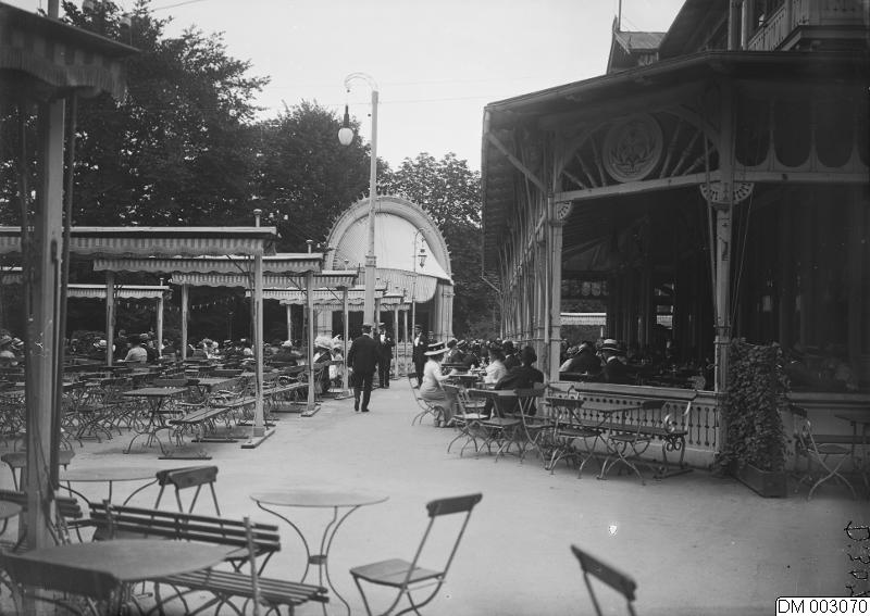 kvinna, man, servering, uteservering, park, byggnader, bord, 1900-talet, stol, byggnad, gamla kungsparken, parker, uteserveringar, stolar, män