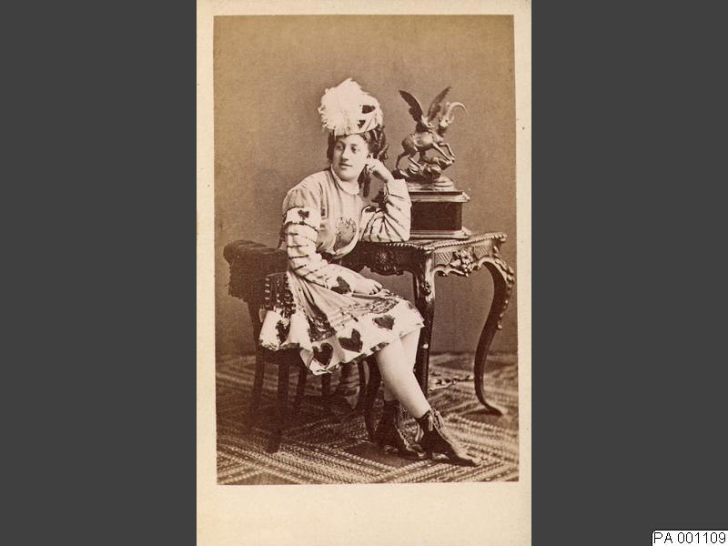 Visitkortsfotografi. Porträtt av skådespelerskan Clementina Fernström, gift Swartz, iklädd en teaterdräkt för en roll.
