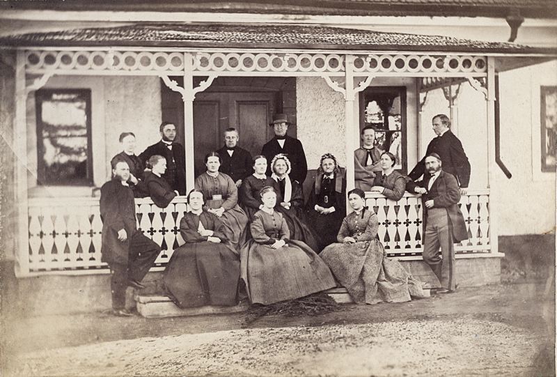 - Kort, fotografi. Sjutton personer står på en veranda till ett hus, bland dem prosten Cles Georg Sylvén, prosten Johan Nordenson och prostinnan Inez Nordensson, född Sylvén. Text på baksidan: Från Hargs prästgård. Längst till höger på balkongen: Prosten Sylvén. Nedanför honom: Prosten Nordenson. Längst till höger på trappan: Prostinnan Inez Nordenson.