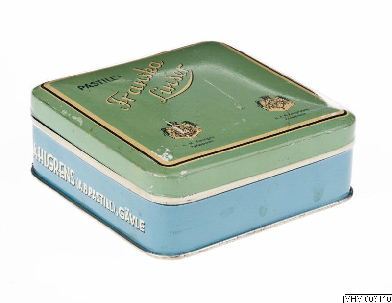Blå och grön plåtask. Har innehållit Pastill's Franska linser. Pastill =