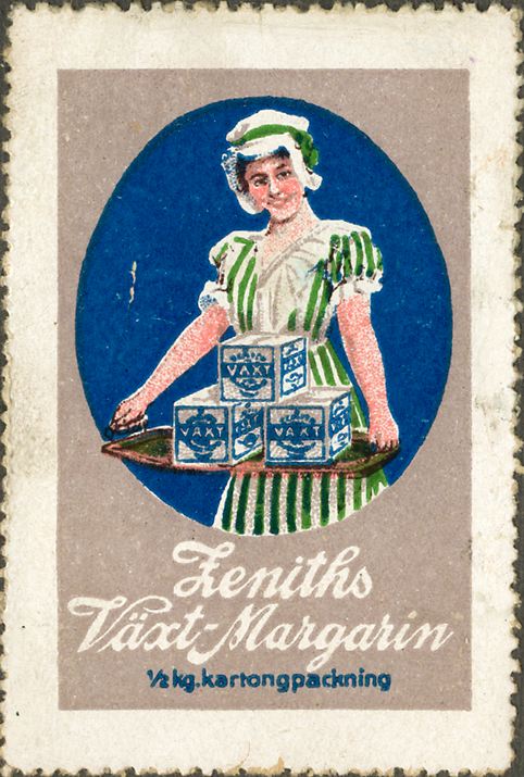 Ljusgrått, blått och gulvitt tryck på vitt papper. Kvinna håller margarinförpackningar på en bricka.