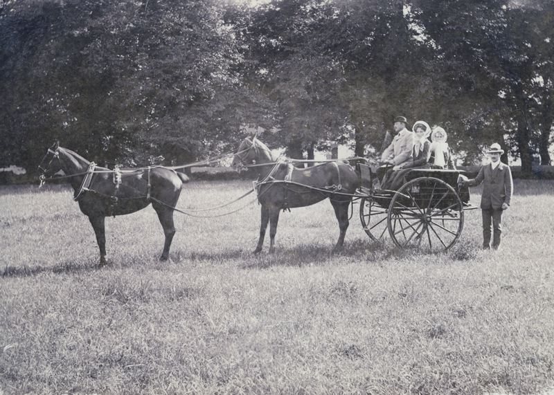 Kort, fotografi. Axel Cronquist och fröknarna Nilsson och Viberg sitter i en tvåhjulig vagn med två hästar i tandem framför. Nils Berg, svåger till Albert Cronquist, står bredvid vagnen som står på en äng med stora träd i bakgrunden i Vellinge 1910. Hästarna heter Pärla och Tösen.