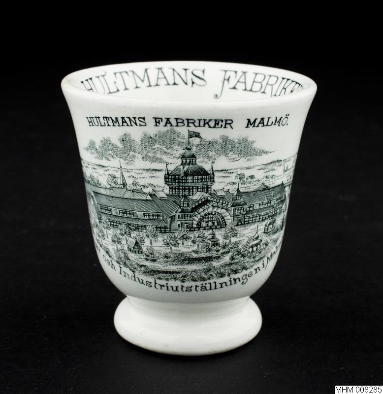 Minnesbägare av porslin från Rörstrand. Minne från Konst- och Industriutställningen i Malmö 1896. Motivet, som är i grönt, föreställer Hultmans fabriker, Malmö.
