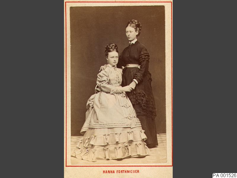 Visitkortsfotografi. Porträtt av givaren Sigrid Holmgren, senare von Diedrichs-Löwegren, tillsammans med Ida Östberg, senare gift Bogren.