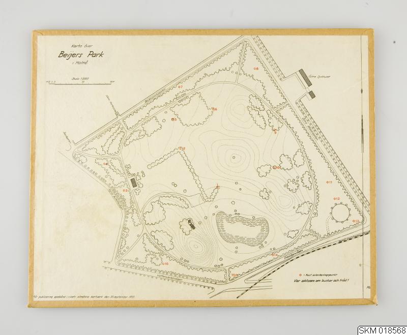 Karta uppklistrad på kartong. Karta över Beijers Park i Malmö.