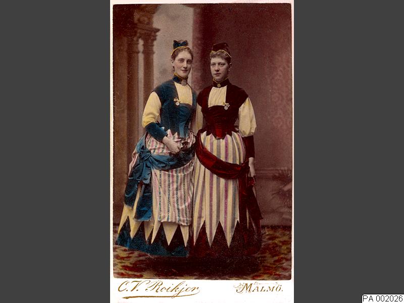 Visikortsfotografi, handkolorerat. Porträtt av Anna Eurenius tillsammans med en väninna iklädda folkdräktsliknande klänningar.