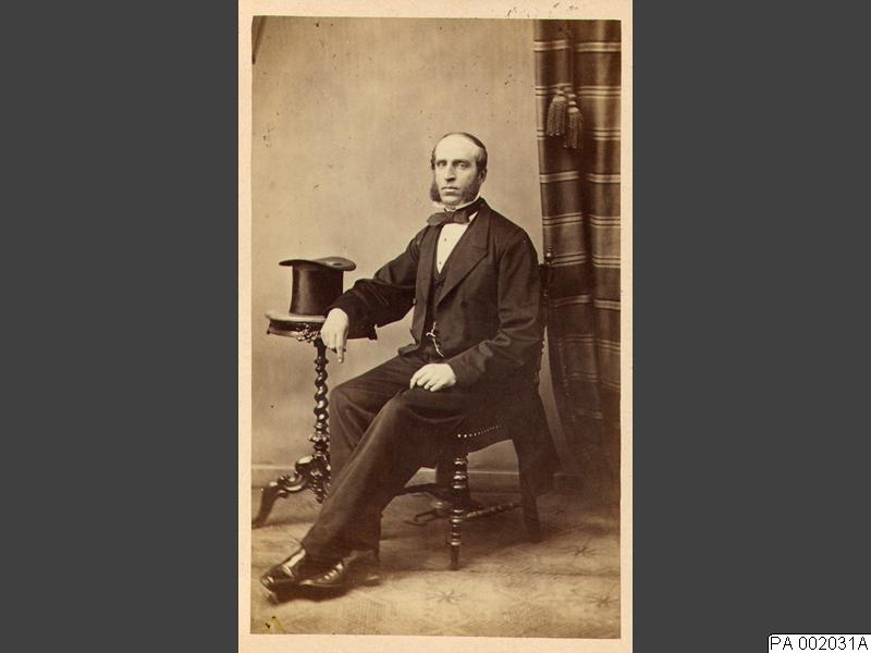 PA 002031A :: man, kostym, hatt, bord, stol, draperi