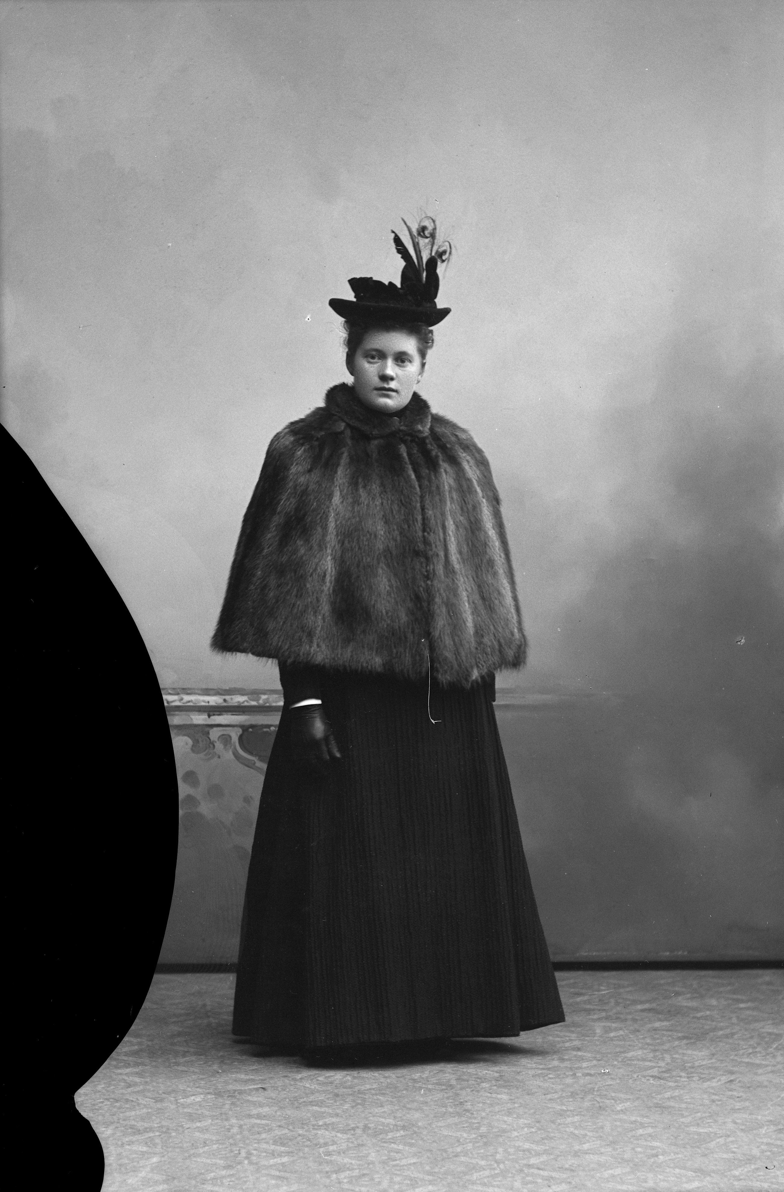 Porträtt i helfigur av pigan Dorothea Edvardsson i hatt med fjäder och cape i päls.