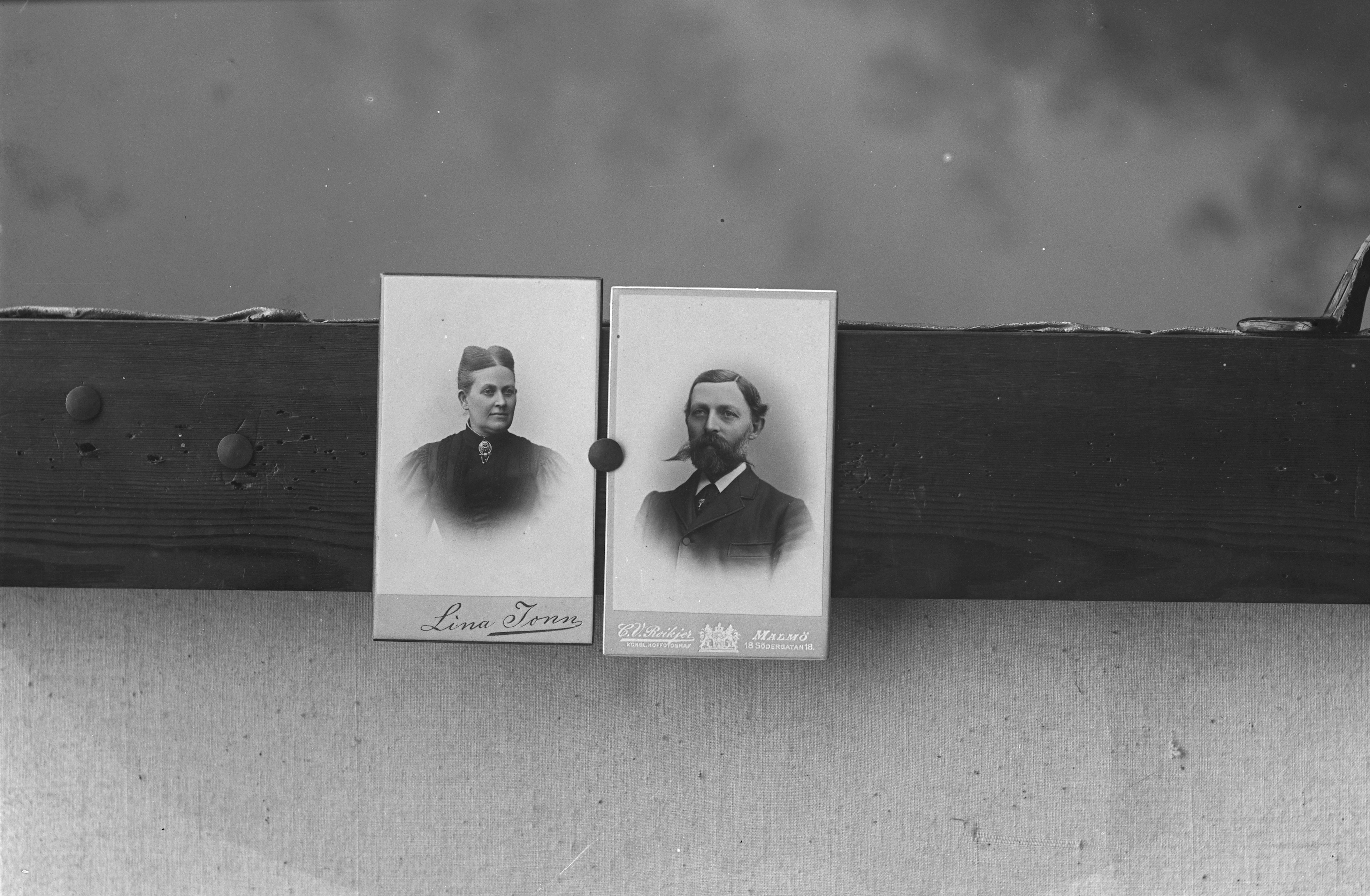 Porträtt i halvfigur av oidientifierad man och kvinna, möjligen herr och fru Borg. Två visitkort med ateljélogotyper, "Lina John" och "C. V. Roikjer /Södergatan 18 /Malmö".
