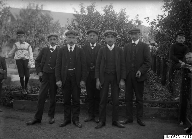 Fem män, iklädda kepsar, stående invid tomt, 1910-tal. Till vänsterstår en pojke, även han med keps. Till vänster står två pojkar intill staket. I bakgrunden syns träd och hustak bakom träden.