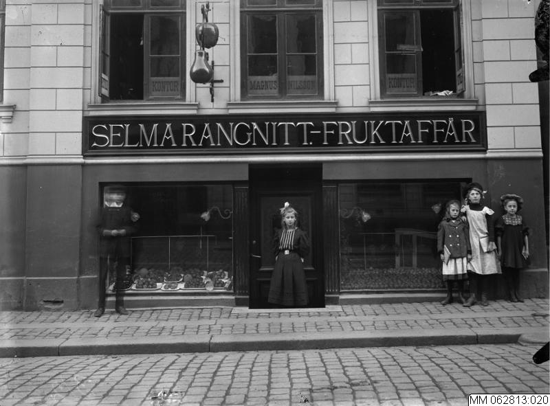 - Selma Rangnitt Fruktaffär, 1910-tal. I butiksingången, som går en halvrappa ner, står en flicka. Frukter syns i skyltfönsterna till vänster och höger om ingången. Vid det vänstra skyltfönstret står en pojke, vid det högra tre flickor.